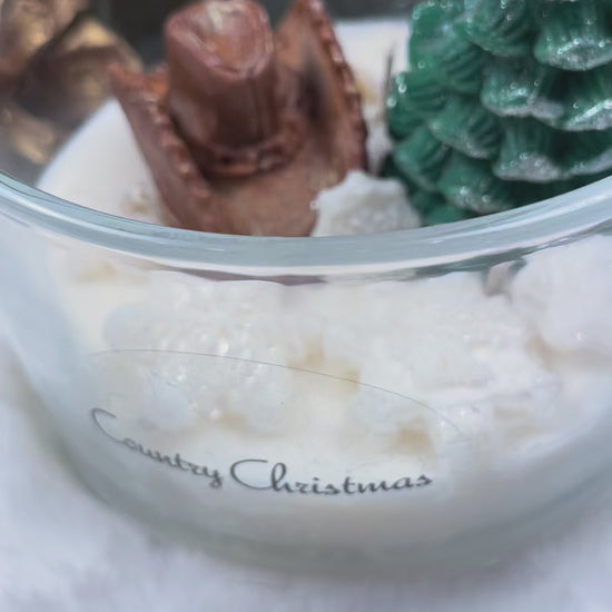 Celebrate the season with a rustic twist in our Country Christmas Soy Decorative 3-Wick Candle. Hand-poured in Michigan using all-natural soy wax, this unique holiday candle features a festive evergreen tree, a cowboy hat accent, and snowy snowflake details nestled inside a clear glass vessel.